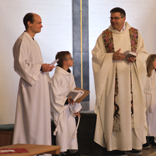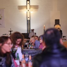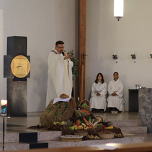So blieb nichts anderes übrig, als kurzerhand die Kirche als Vesperkirche herzurichten. Nach dem schönen, stimmungsvollen Erntedankgottesdienst unter der Leitung von Pfarrer Klein, bei dem auch gleich der neue im Pastoralteam, Matthias Breuer, vorgestellt wurde, hieß es deshalb zum Schluss statt „Ite missa est“ (Das war die Messe) „Guten Appetit!“ in der Kirche. So weitete sich das Mittagessen zu einer ausgiebigen Agapefeier.