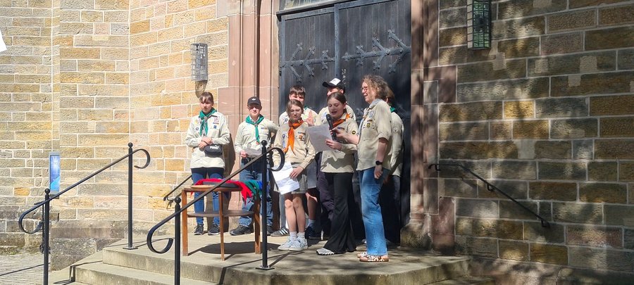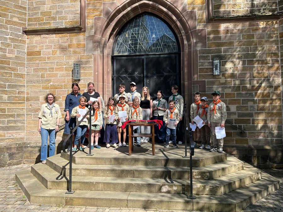 Bei sonnigem Wetter hatten sich auch zahlreiche Gäste eingefunden um bei diesem besonderen Anlass dabei zu sein. Im Mittelpunkt stand die Geschichte des heiligen Georg und sein mutiger Kampf gegen den Drachen, der sinnbildlich für Mut und Einsatz steht. Der Höhepunkt war dann die Versprechensfeier, bei der die Teilnehmenden im feierlichen Rahmen ihr Versprechen ablegen. Im Anschluss bei Kaffee, Kuchen, Würstchen und guter Stimmung wurde der Kirchenvorplatz zum lebendigen Ort der Gemeinschaft der Pfadfinderfamilie.